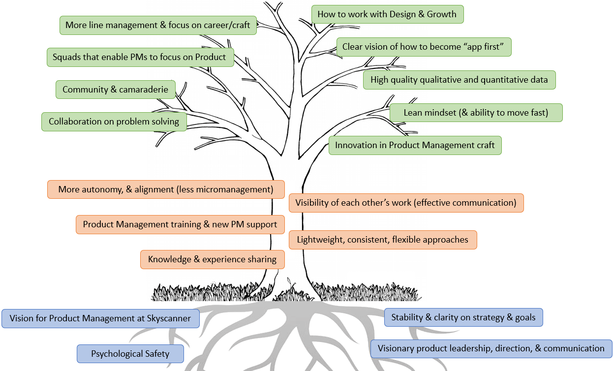 The results from each retrospective were combined, synthesised, and distilled. Once again, several strong themes stood out, and we had a lot of rich details to dig into. Some themes we had full control over; others were more tightly coupled with Skyscanner as a whole and had dependencies external to product management. Many of the issues raised were interrelated, and some were symptoms of more fundamental themes.