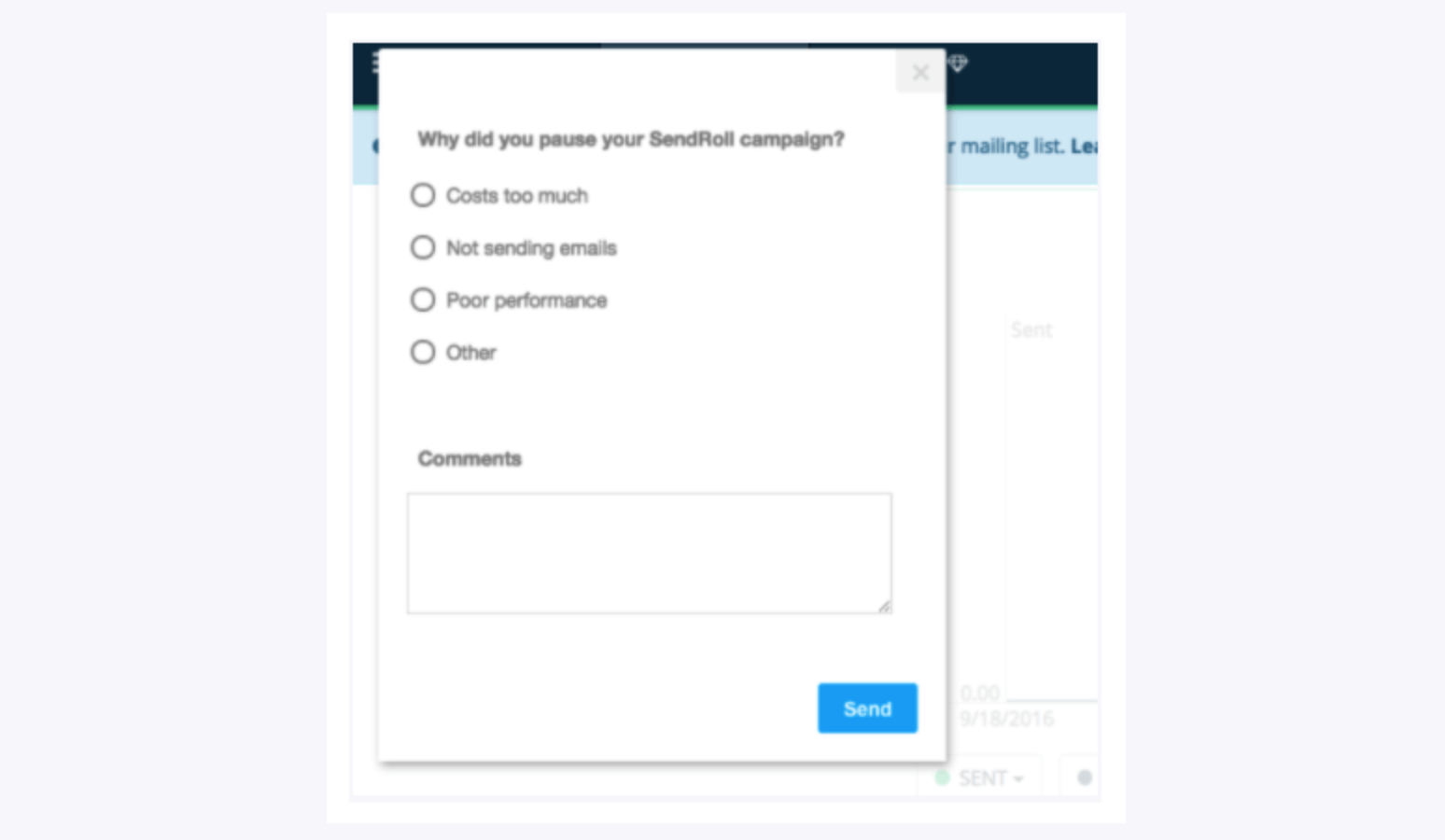 Another example of giving your product a voice: AdRoll uses a “pause interceptor”: a pop-up modal that triggers whenever a user hits pause on their campaign, offering them a timely opportunity to share their grievance. User responses are sent straight to the AdRoll customer support team, so the team can jump in and solve the users’ problems just minutes after they happen.