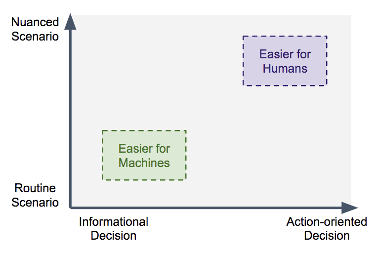 Along the y axis, routine scenarios happen in high frequency and have low variability in how they unfold, while nuanced scenarios seldom occur and could contain hard-to-replicate subtleties. On the x axis, informational decisions provide additional context to the end user, while action-oriented decisions perform an action on behalf of the end user. Routine scenarios tend to generate more reliable training datasets and are therefore easier for machines to learn; informational decisions tend to be lower risk than action-oriented decisions. Combining these two dimensions yields four categories of automated decisions: