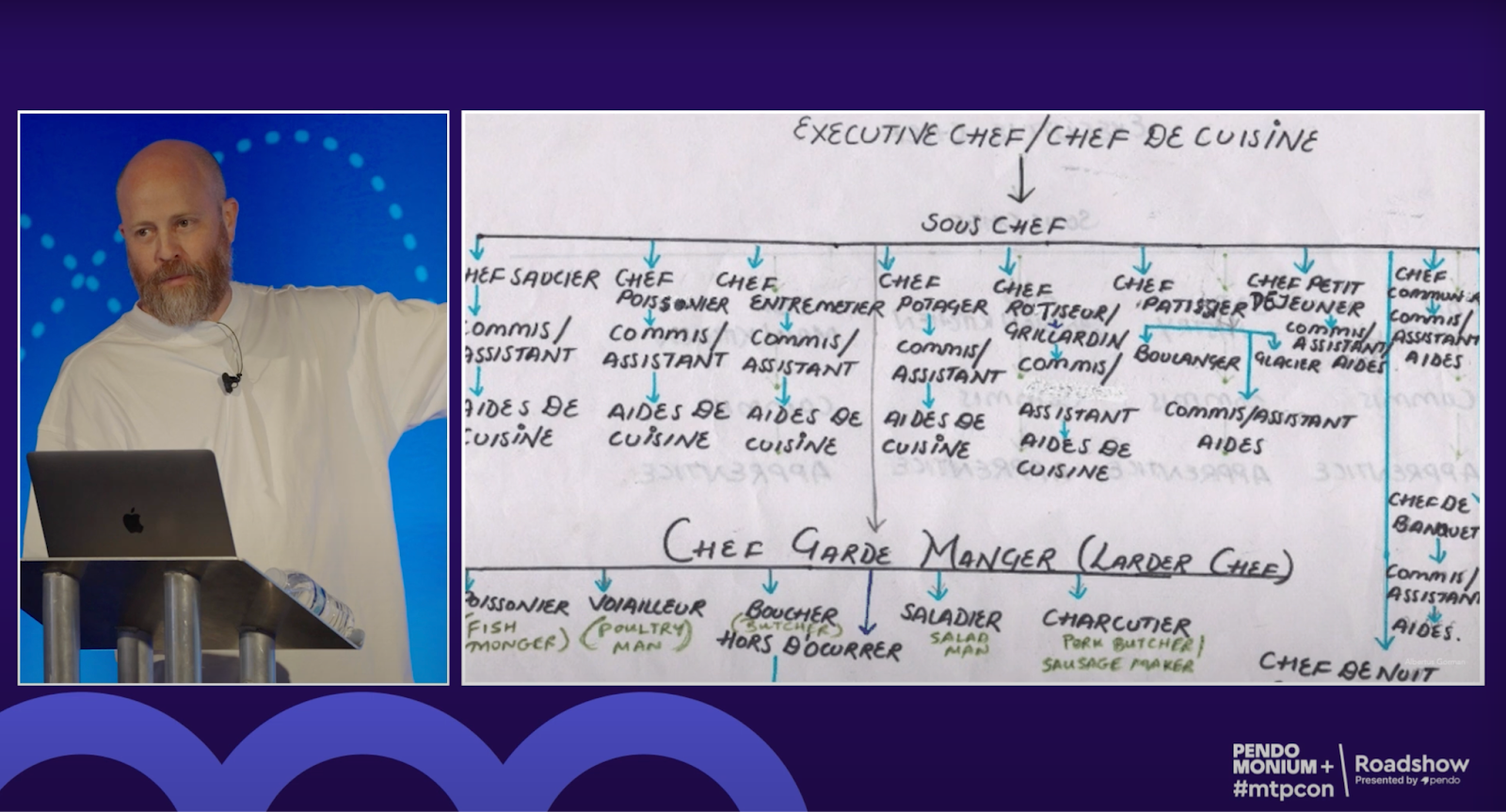 Jonty began by highlighting the increasing interest in product management over the past 20 years. He drew a vivid analogy between a restaurant kitchen and the product hierarchy, explaining how the clear reporting lines in a kitchen mirror those in product teams. However, he pointed out a crucial difference: while an Executive Chef (akin to a CPO) would likely be adept at making pastry, a product leader might not have a deep understanding of every specific role within their team.
