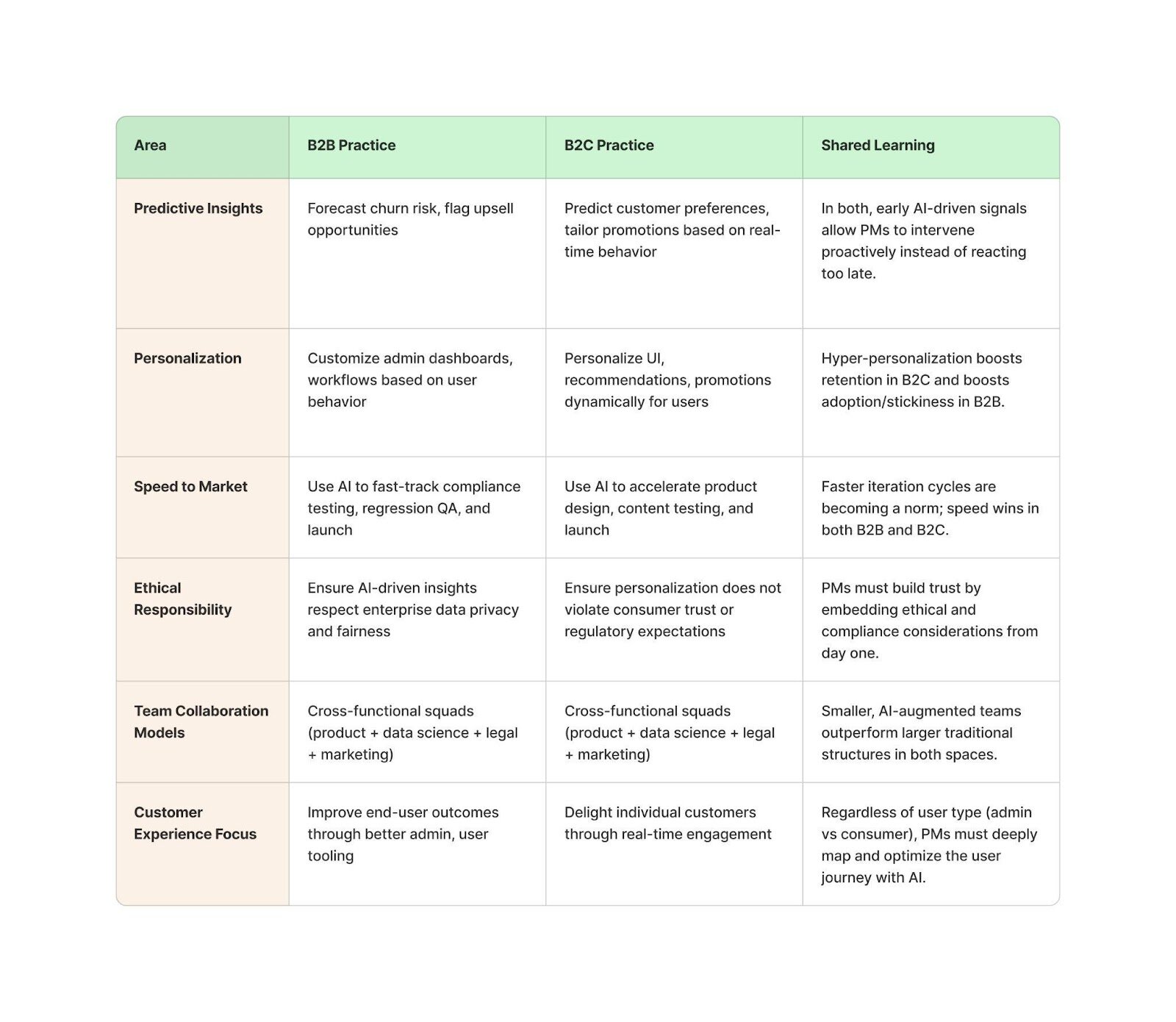 While the impact of AI on B2B and B2C product management looks different on the surface, many of the underlying lessons are transferable. The table below breaks down key takeaways across both domains and how product managers can apply these learnings to build smarter, faster, and more responsible products, regardless of audience.