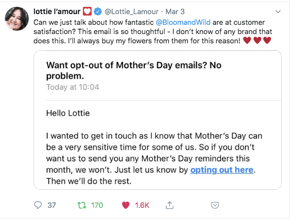 We sent out the Mother’s Day opt-out on the first Sunday in March and were totally blown away by the response. Almost 18,000 customers opted-out and over 1,500 customers responded to us about the campaign via email, phone, Twitter and Instagram – many emailing to thank us for the consideration and thoughtfulness we’d shown. In fact, the response so exceeded our expectations that many of the team jumped onto Zendesk on the Sunday and the following Monday to respond to all our customers.