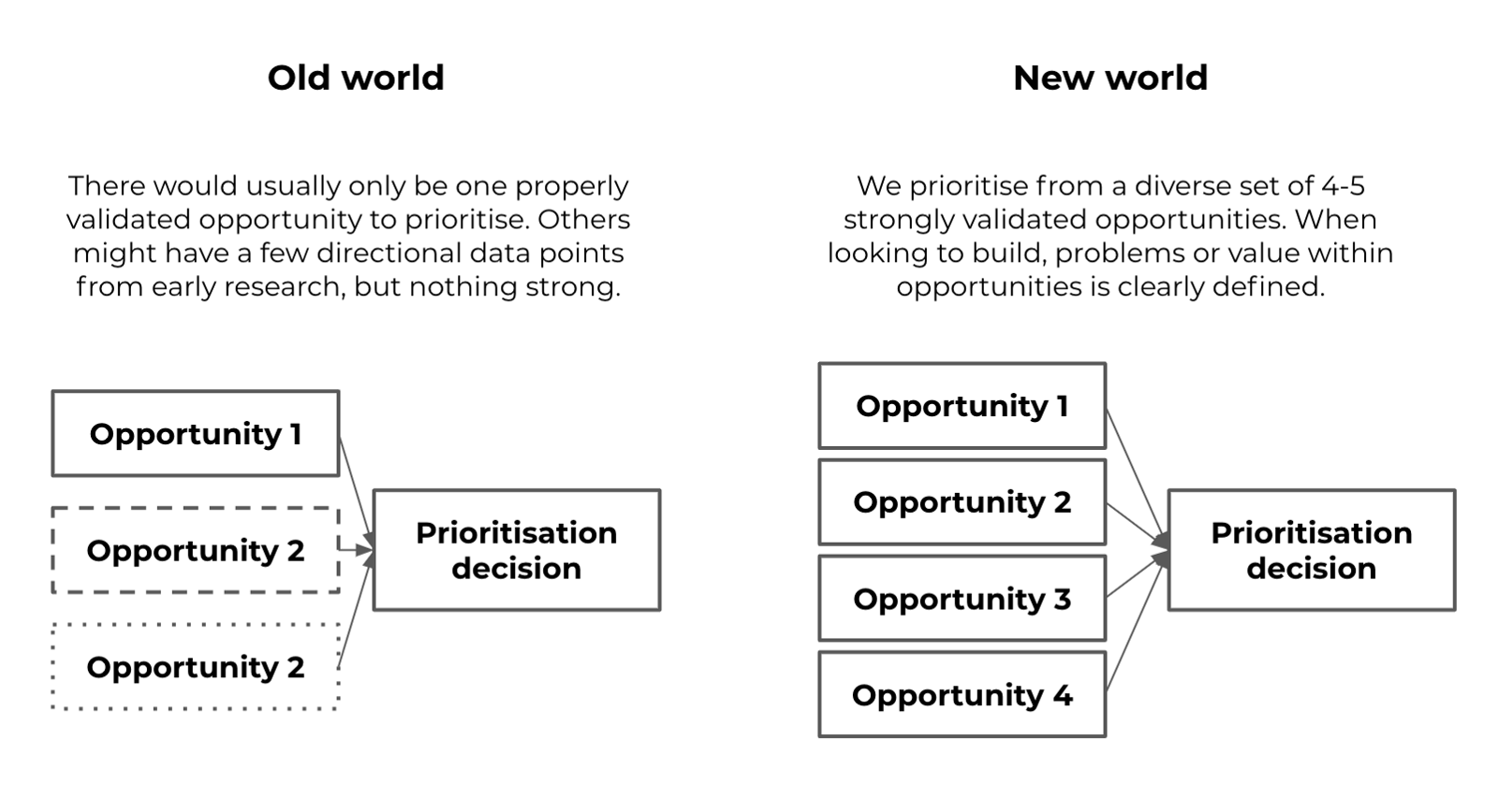 We wanted to move to a new world where we always had enough information to make reliable decisions on prioritisation. We’d unlock other benefits in this world too – better-researched opportunities would inevitably mean better execution. And if we developed pipelines of discovery work, squads would never waste any time waiting for valuable things to build.