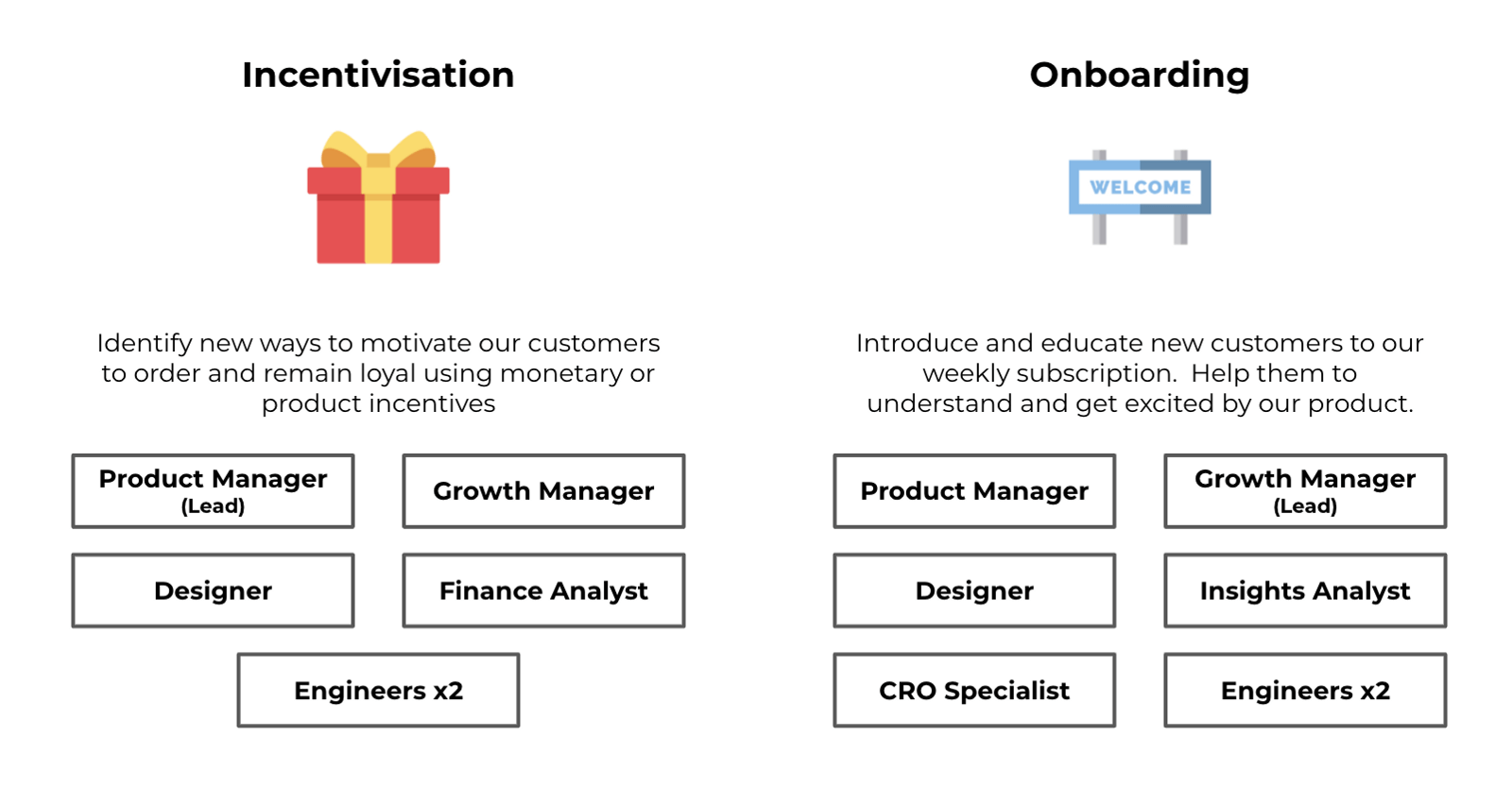 Discovery teams (DTs) structure our discovery processes at Gousto. They usually map to our core strategic themes (e.g. “educate all customers about our subscription after signing up”). We might uncover these overarching themes through a range of market insights and customer research. And once we feel strongly about a theme, we launch a discovery team to validate whether it’s genuinely valuable and identify the most compelling opportunities within it.