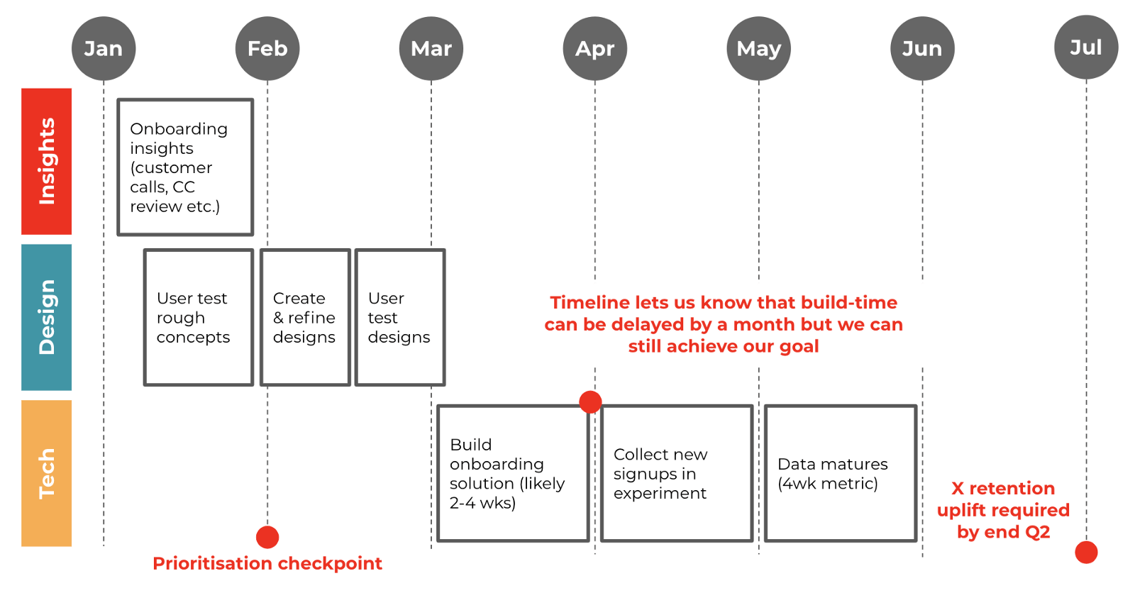 Take a hypothetical example of our onboarding discovery team. If we expect a specific retention uplift from investing in onboarding opportunities by the end of Q2, the team knows they need to ship at least one test in that quarter to deliver this uplift. Working back, that means we need to conduct insights and concept testing work straight away in January, closely followed by design refining and user testing. We also know that if we’re only planning to ship one test, we have one month of flex with which we can push timings back.