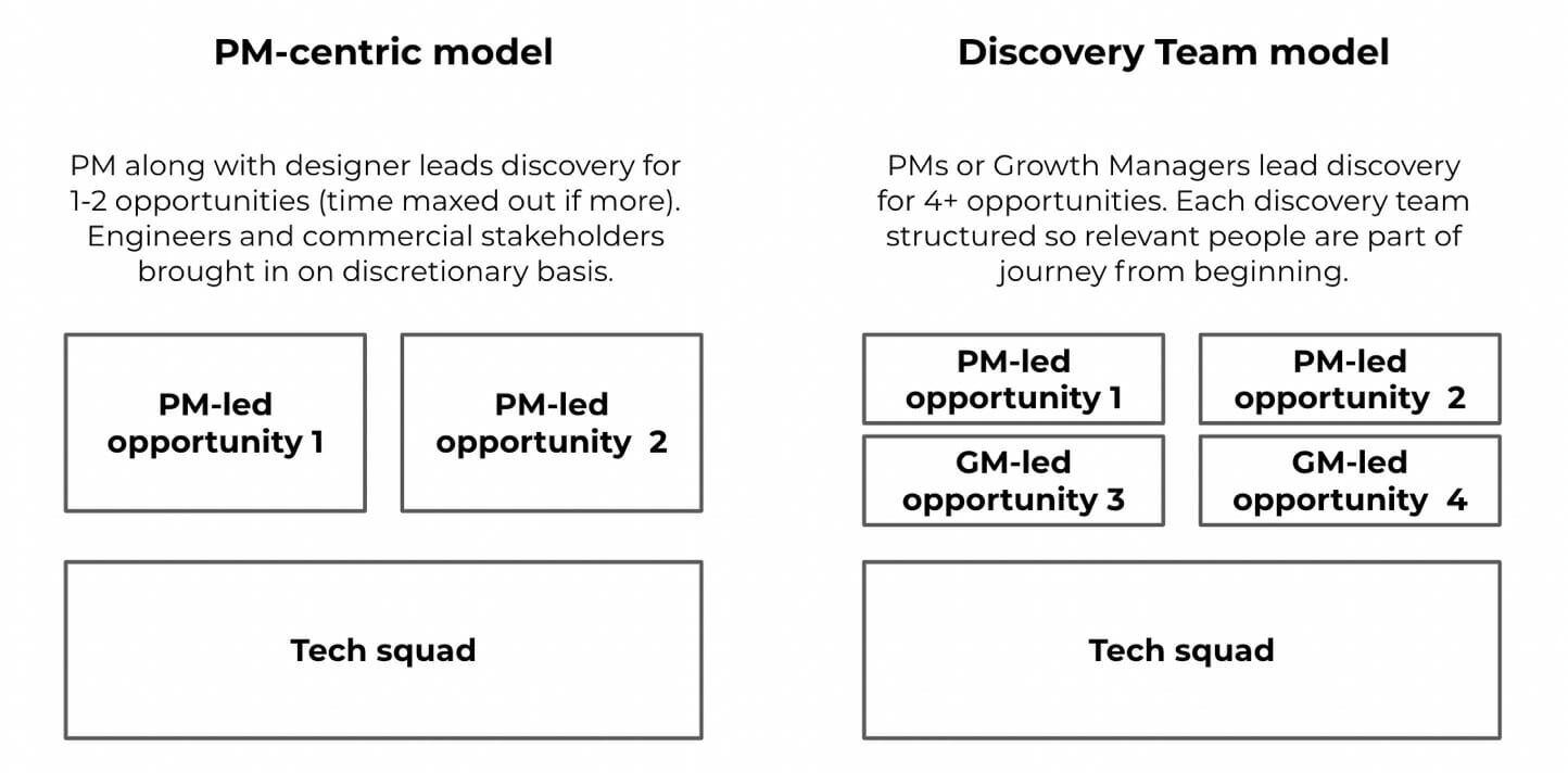 Discovery teams sit above tech squads, managing the “incoming flow of insight” and making sure each tech squad prioritises effectively. But squads and product managers still own and manage delivery and ultimately make prioritisation decisions.