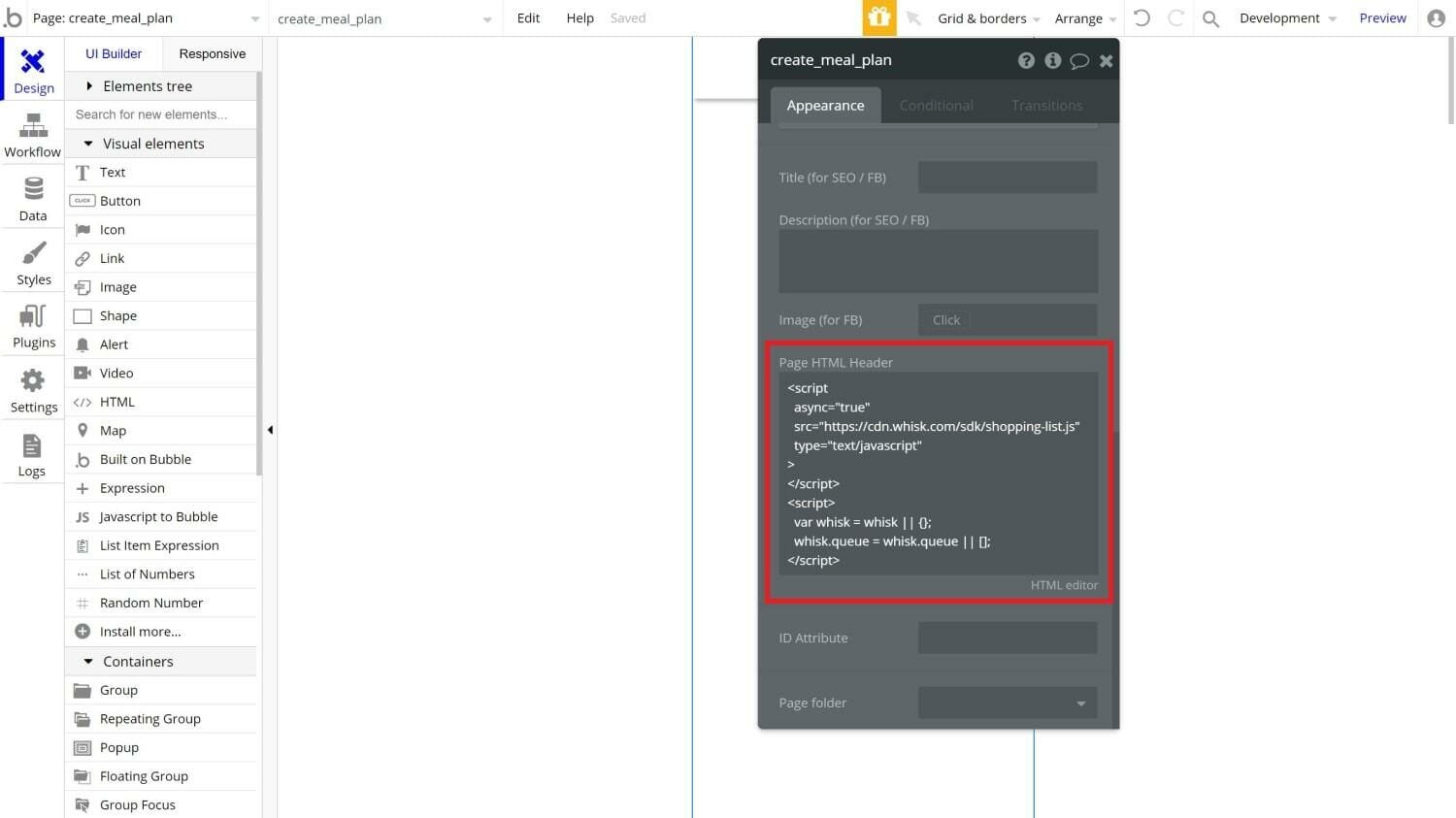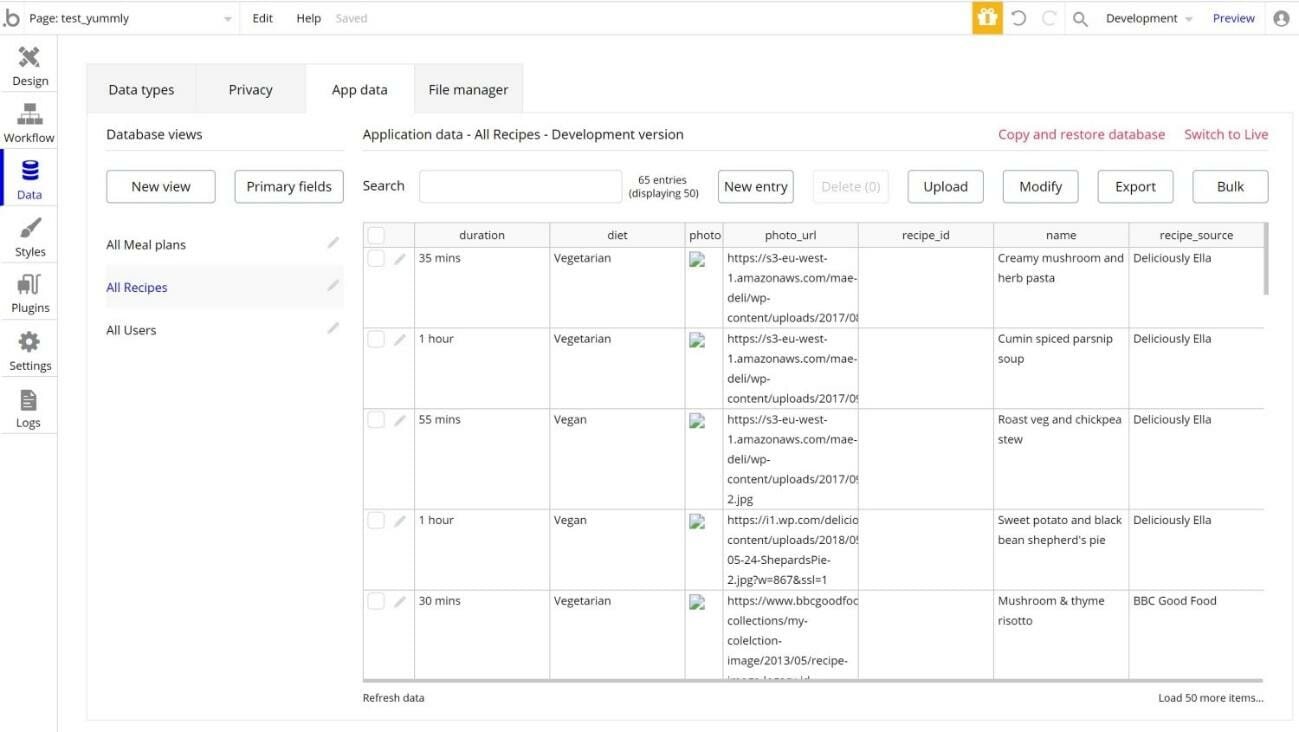 At risk of hitting a dead end, I decided to manually add recipe data into the app. This involved copying recipes into an Excel sheet then uploading this using Bubble’s file uploader (no need to create a separate database). It certainly wasn’t a long-term solution but at least allowed me to continue.