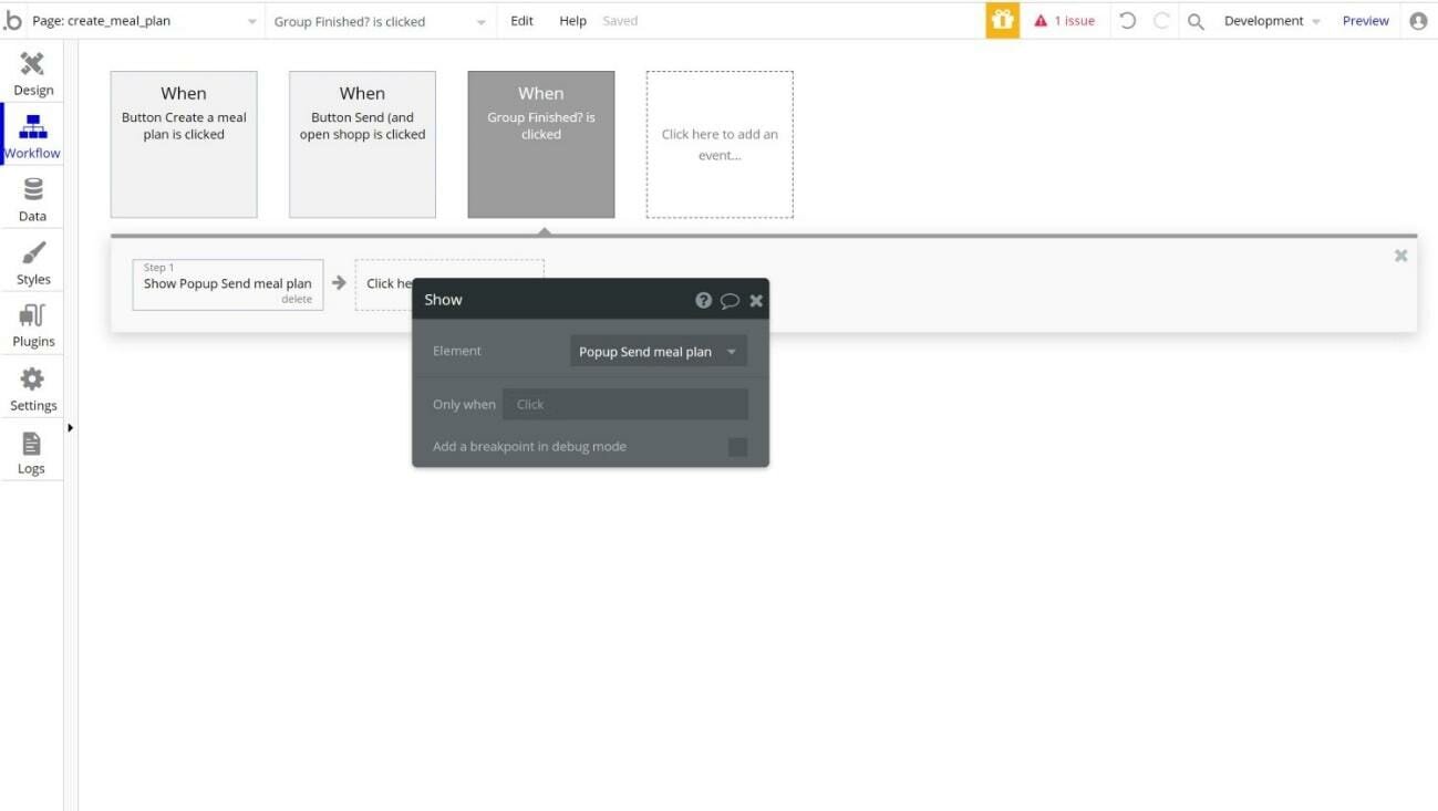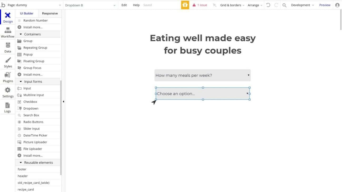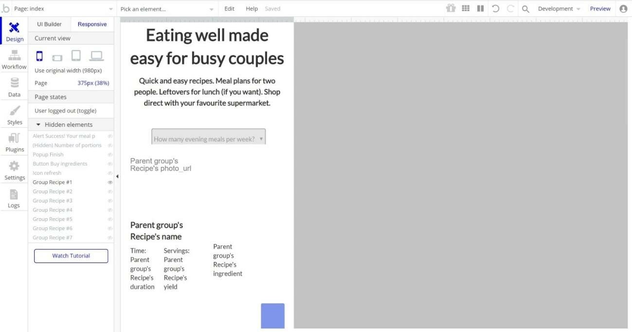 For the UI design, Bubble has a simple Wysiwyg editor and I started by just copying the design from the prototype.