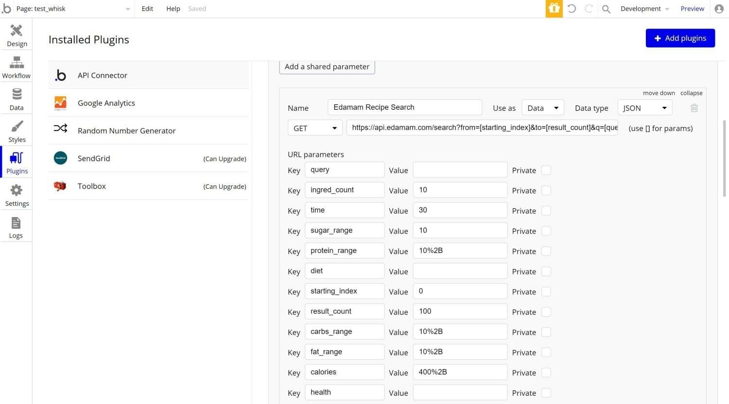 I found a few publicly-available recipe APIs including Yummly, Edamam, Big Oven and Food2Fork, and concluded that Yummly and Edamam were the best matches for my requirements. So, I signed up for free developer accounts with both and created little test pages in Bubble.