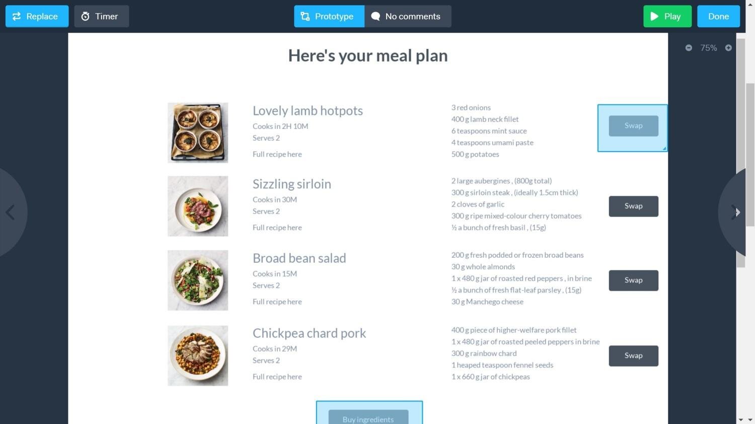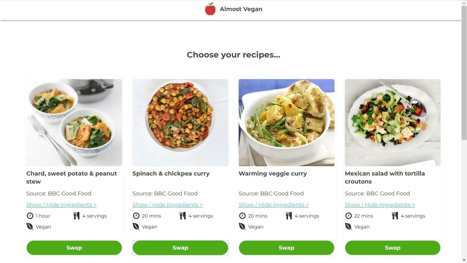 I also wanted to be able to choose the number of meals each week and servings per meal, swap a recipe, view recipe details, and use it from my laptop and mobile. The latter meant creating a web app that’s accessible from an internet browser (as opposed to a mobile app).