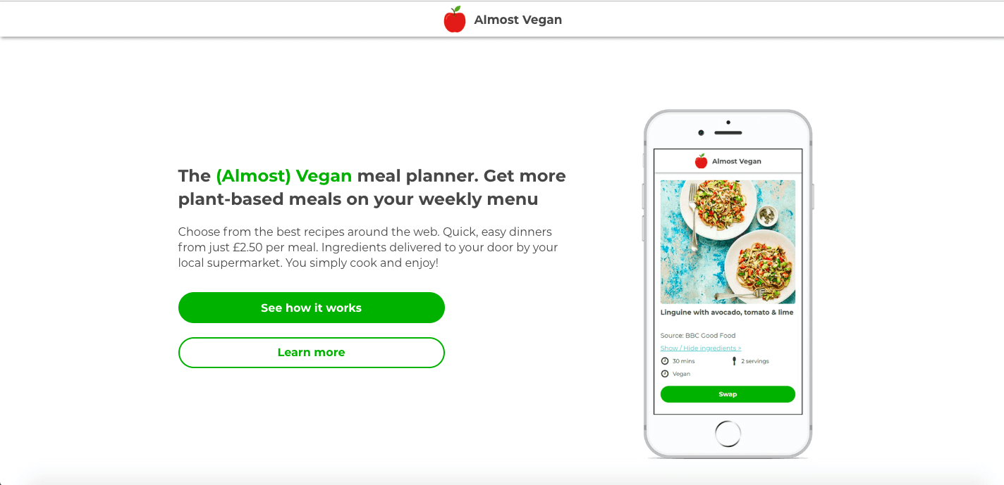 The name – (Almost) Vegan – was inspired by the growing popularity of plant-based food and my goal to reduce the amount of meat I eat. And for the landing page copy, I studied popular online forums to see what people were saying about diets, meal planning and recipes boxes.