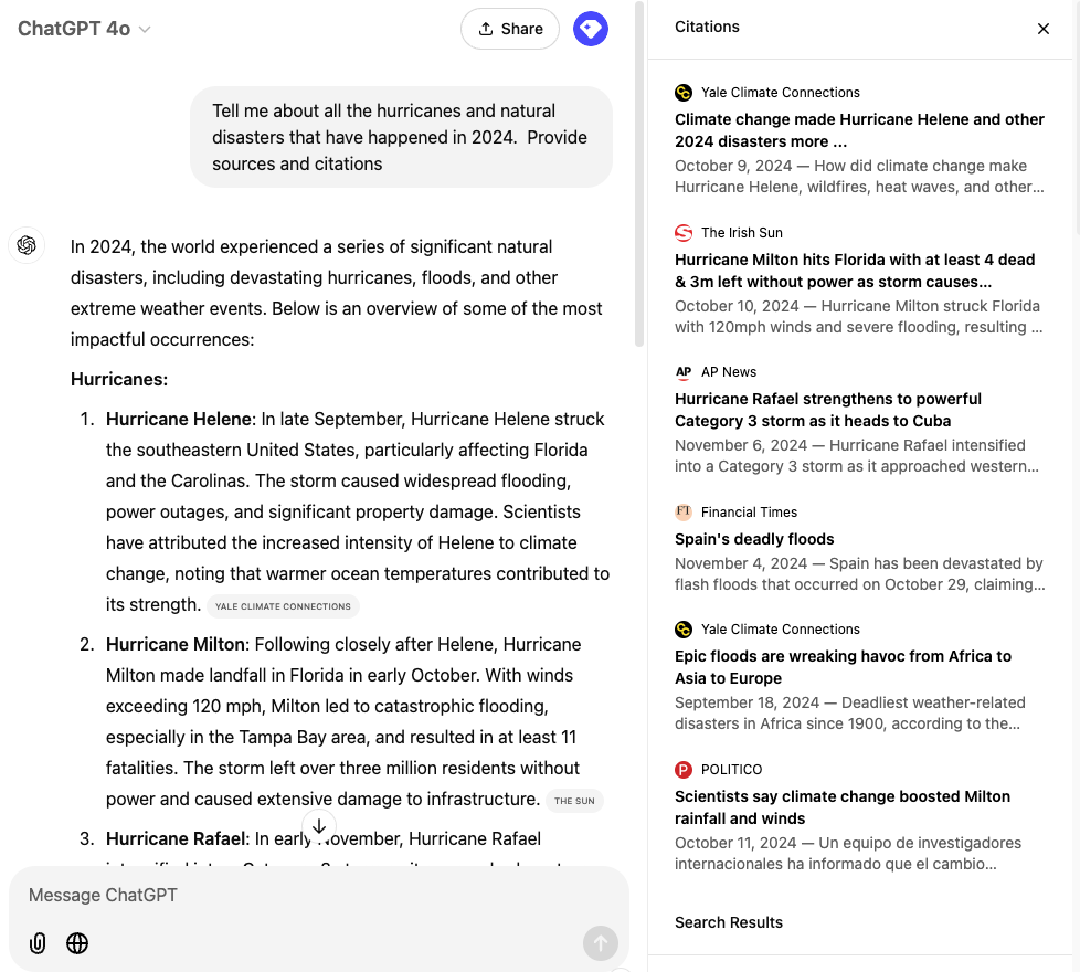 ChatGPT 4.0 Enterprise showing sources of its insights – Screenshot as of November 11, 2024