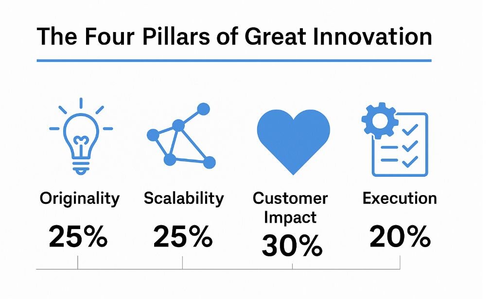 After hundreds of evaluations, four dimensions consistently separated the winners from the wannabes: originality, scalability, customer impact, and execution. I weigh them at 25%, 25%, 30%, and 20% respectively, though the exact mix depends on context.