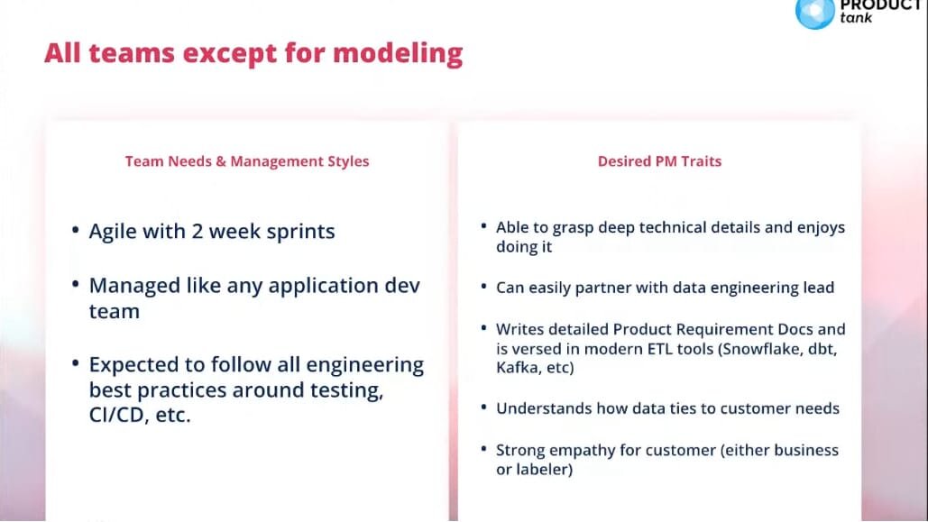 Additionally, Jon explained that data-centric product managers should be able to easily partner with the data engineering team, understand how data ties to customer needs, and have a strong empathy for the customer. “Teams will always go deep on the data, but can often lose sight of the customer,” Jon said, “it’s important for the product manager to always ask ‘does this make sense for the user?’ This is a fundamental value for any product manager, regardless of whether they are working with data teams or not,”