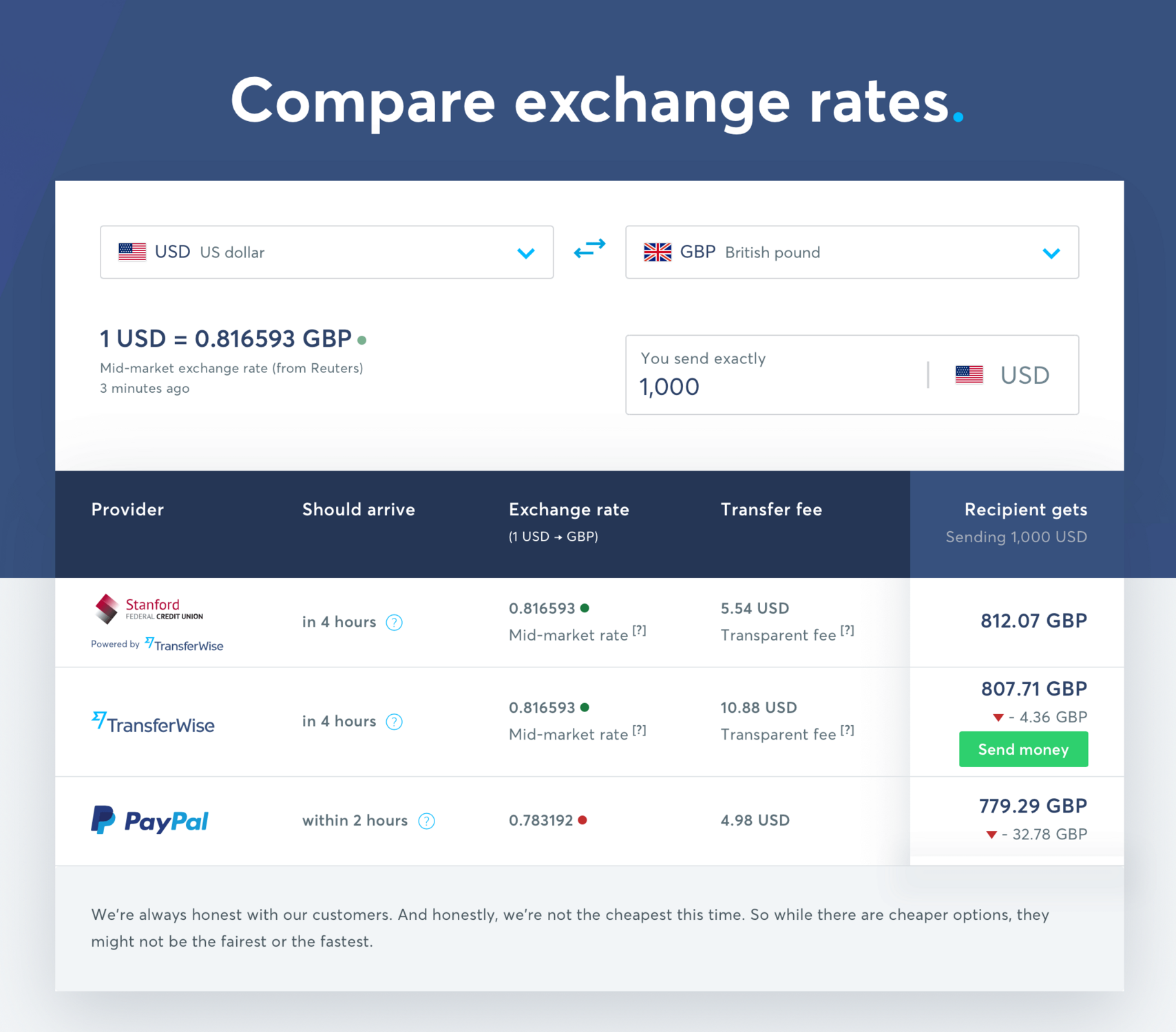 Think about how much effort you put into researching products you want to buy. People often get frustrated if they have to read through several long lists of specs, so why not make it easier for them? Transferwise earned so much trust by not only being transparent about its prices but by also making it easy for customers to compare its rates with those of competitors. If Transferwise isn’t the best choice at that particular time, it will tell you which provider is. So even when it doesn’t provide the best rates, it keeps earning the trust of its users.