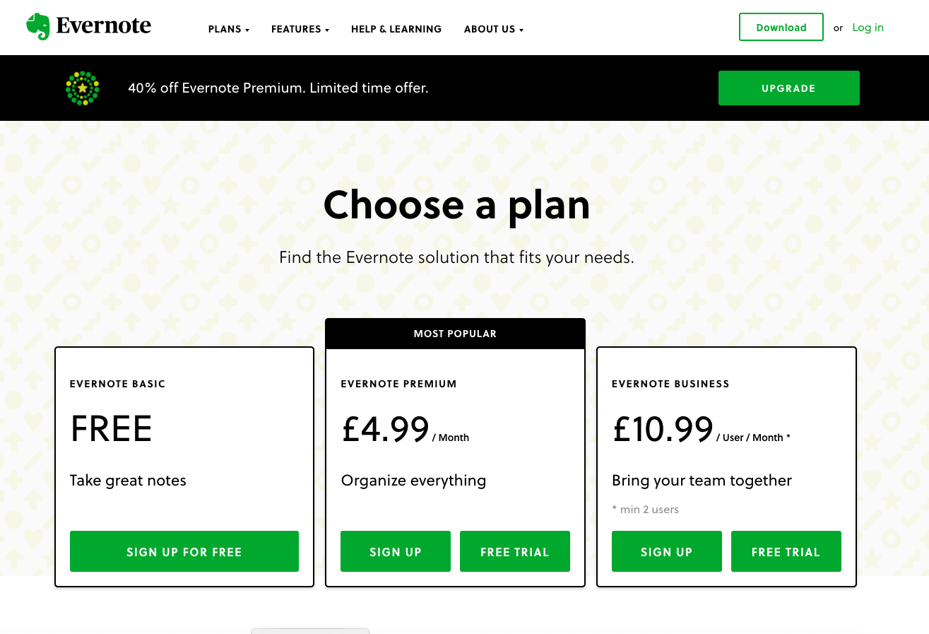 You should always keep your communication simple, clear and transparent, and if you can, make the cost of research minimal. Help your customers understand why your product is a cut above the competition. If your product is the priciest among the competition make sure the reason why it’s worth more stands out. Don’t underestimate the power of an honest explanation! It is also crucial to communicate outcomes rather than focusing on the features of your product. How will your product change the life of your customers? They don’t care about long specs, what they care about is the impact of your product. A good example of this is how Evernote communicates outcomes such as 'Take great notes', 'Organize everything', and 'Bring your team together' in its packages, as shown here: