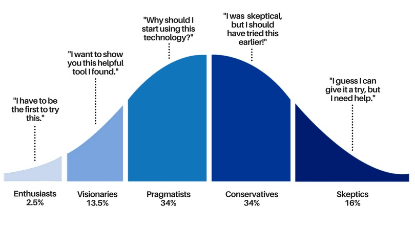What’s important to bear in mind is that for any new tool or process, there will be one or two colleagues out of ten who will enthusiastically try it out – the so-called innovators and early adopters. Of the remaining eight, though, seven will need to be convinced, pushed, and engaged even just to give it a try, and one-two will likely never accept change. This is the truth, it hurts, but the sooner we accept it, the better.