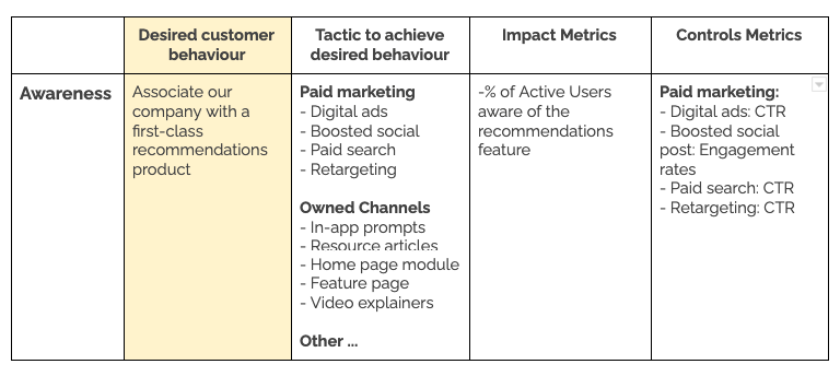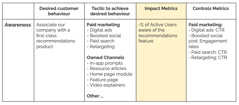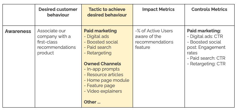 They planned the necessary tactics to achieve that desired customer behaviour. For example, at the Awareness stage, the tactics are mostly marketing focused and find ways to highlight the feature within the product.