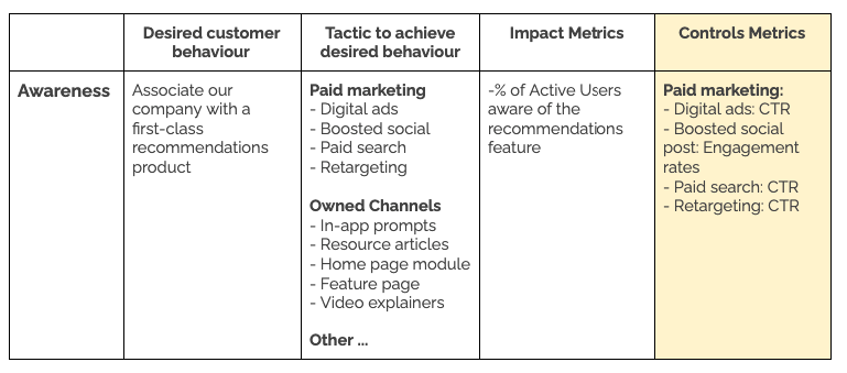 And finally, the Control Metrics – how they would actually measure the success of the Impact Metrics, for example, through digital ad Click Through Rates (CTR) or social post engagement rates.