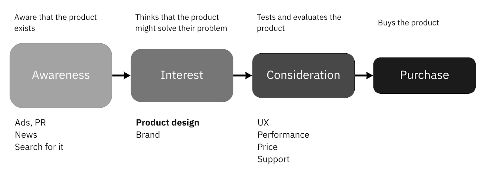 As you can see here, the customer is getting aware of the product through ads or searching for it because of their need. Then they get interested if they got a connection with the brand or they like the product design. Then they go a step further and read more about it and try out the demo. And if the price is within the budget, this customer is likely to buy this product.