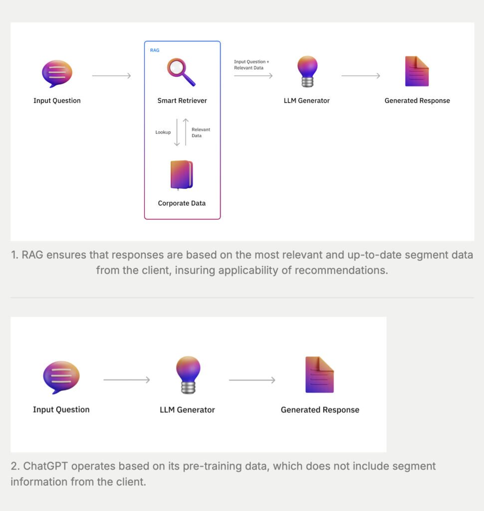 - Retrieval: RAG uses a retrieval system to fetch relevant audience segment data snippets from a vector database. This database can include segment description data, internal annotations and metadata.