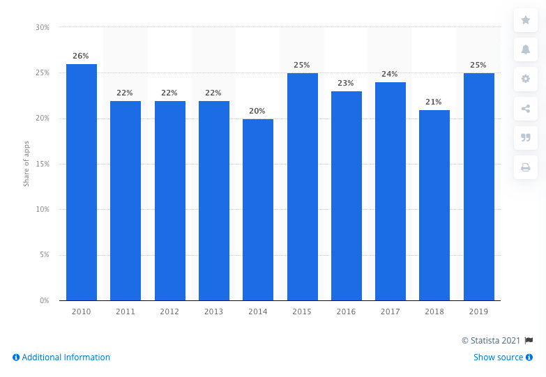 Understanding mobile usage is critical to success. An average smartphone user has 40 apps installed on their mobile phone, taking just two taps to pull your users away from your app and into another. The truth is that getting a user to download your app is only a small part of the battle. According to Statista, here is the percentage of mobile apps that have been used only once from 2010 to 2019: