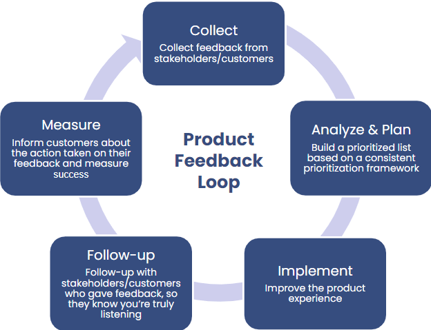 A "Product Feedback Loop" is a continuous cycle in which feedback about a product is collected from users, analyzed by the product team, and then used to make improvements to the product. Once these improvements are implemented, the team follows up with users to ensure the changes address their feedback effectively. This ensures to evolve product based on user needs and preferences while consistently validating its effectiveness