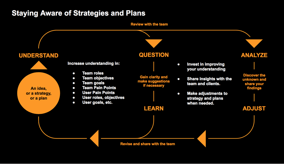 To ensure the team understood how their ideas affected the strategy and plans, I created a mental model (see above) designed to help us guide conversations in order to meet objectives, goals, understand pain points, team roles, customer roles, and address the right items at the right opportunities. When speaking about objectives and goals, keep in mind that in this situational context, a goal is what you want your customers to know, think, and feel about your product. An objective is what your product needs to have in order to meet that goal. Keeping your goals and objectives in mind means also keeping in mind your customers, action steps, and deliverables.