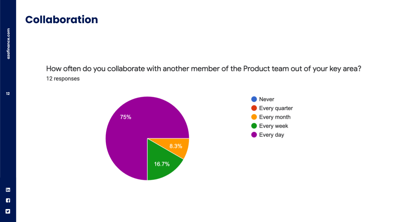 Once responses have been collected, the product leadership team meets together to analyse and determine how to improve product dynamics based on results. For example, once we detected a big drop in the collaboration value and after some digging, we realised the product squads were working in silos. We immediately restructured the squads to be multidisciplinary, and we advocated for regular inter-squad communication. Read this case study on cultivating collaboration across large product organisations.