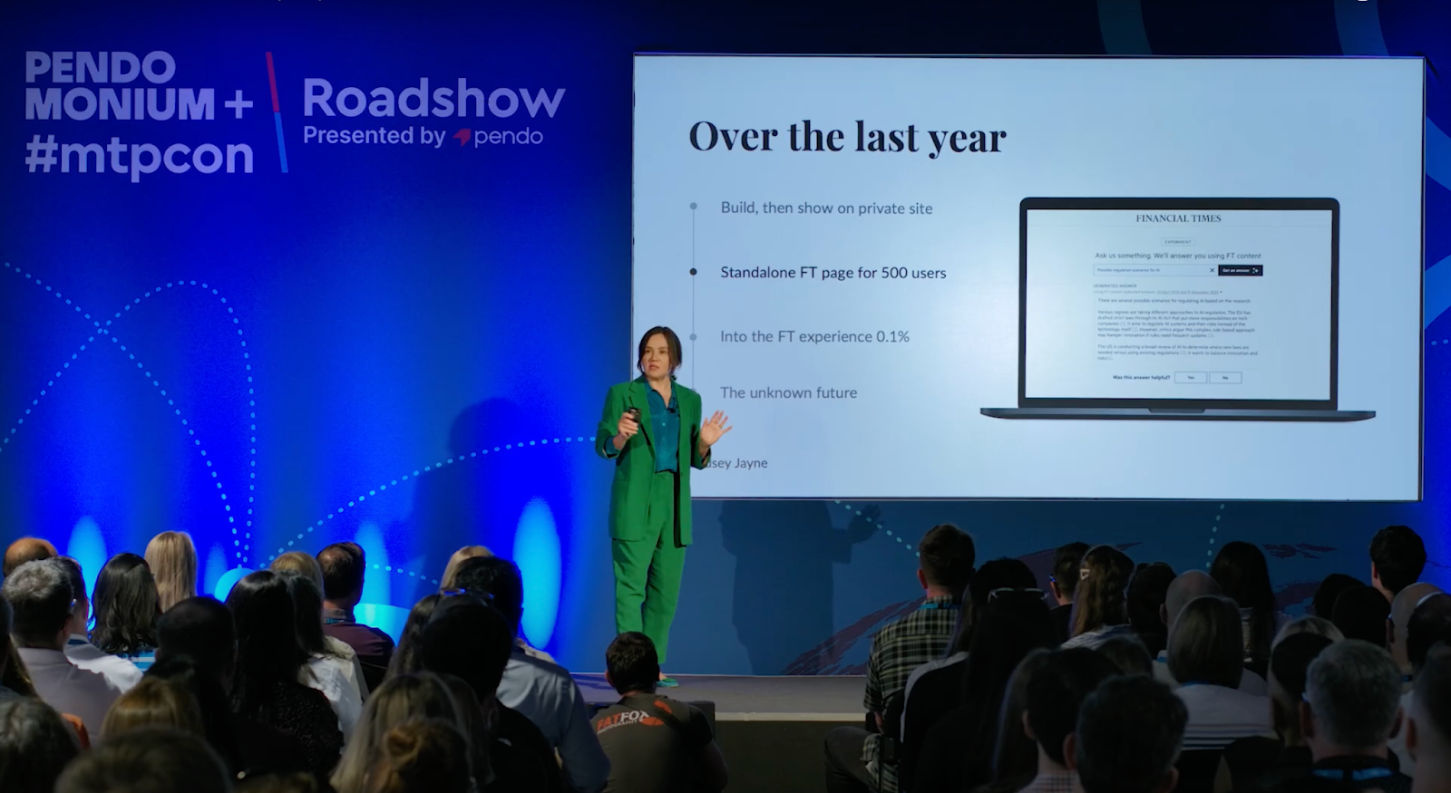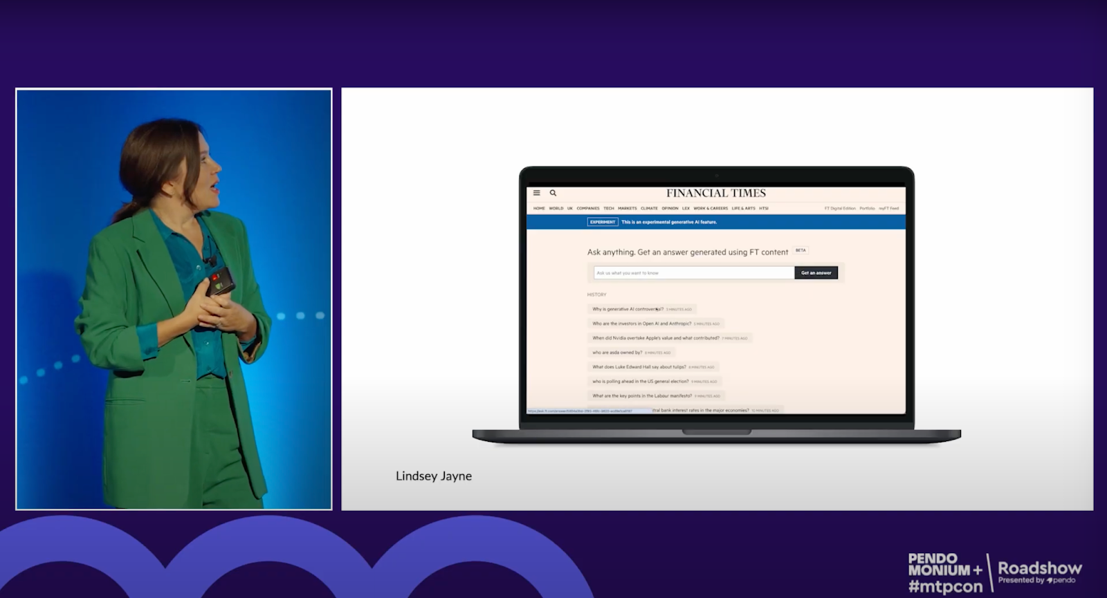 At the Pendomonium + #mtpcon roadshow in London this year, Lindsey Jayne, Chief Product Officer at the Financial Times (FT), shared the company's journey of integrating AI into its product offerings.