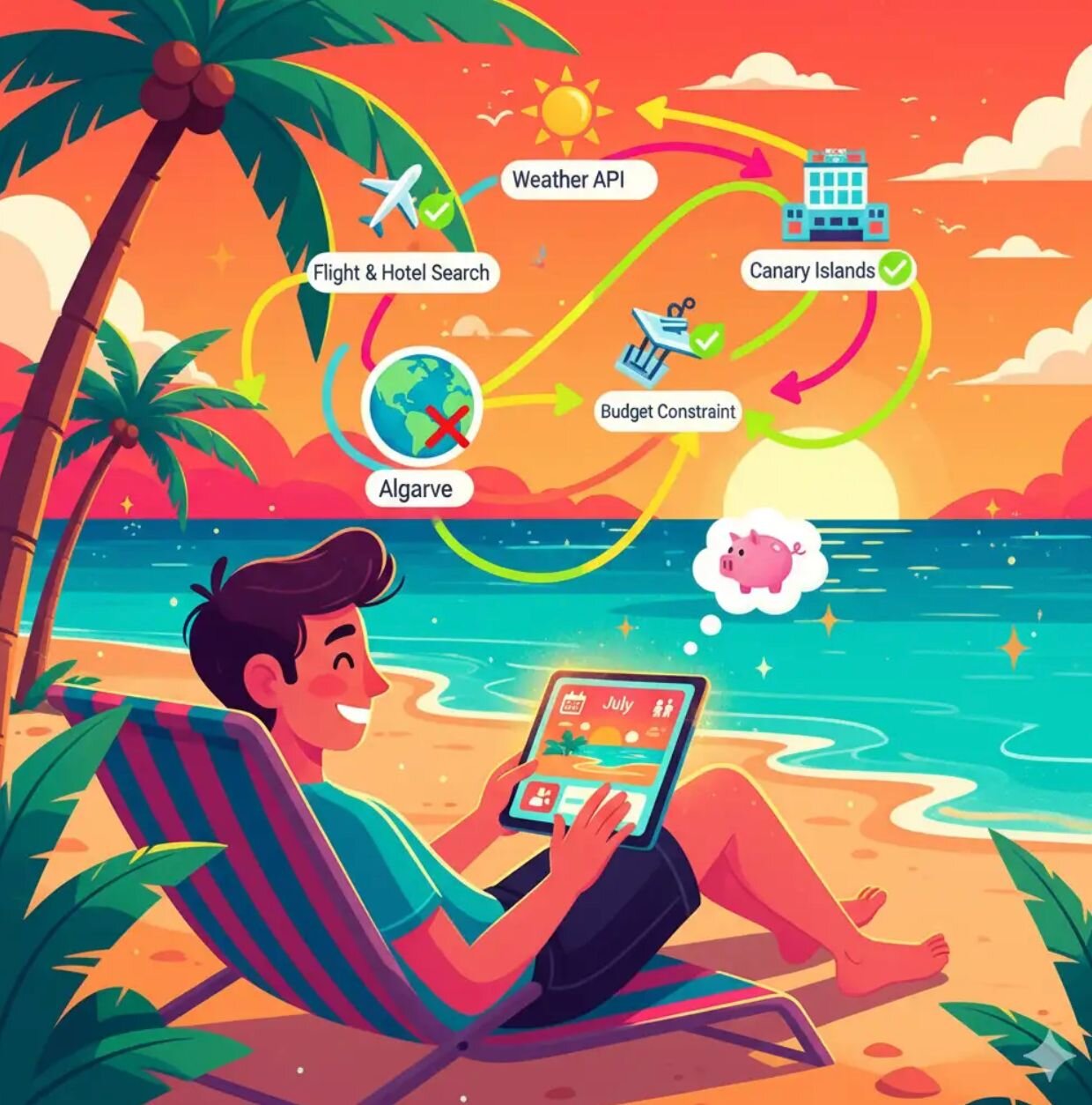 Imagine an Agentic AI travel planner is asked to find a budget-friendly beach vacation in July. The agent starts a dynamic workflow. It uses a tool (a weather API) to rule out destinations like the Caribbean and then checks live flight prices to the remaining options. If it finds a great flight to the Algarve, Portugal, it then uses a hotel API and dynamically decides the local accommodation costs are too high, violating the "budget-friendly" constraint. Using its memory of all prior checks, it pivots to the next-best destination, the Canary Islands. It continues this iterative process, checking availability, re-evaluating the budget, and taking practical action, until the complete, bookable goal is achieved. Once a viable plan is formed, the agent doesn't just display it, it uses an API to share the proposed plan directly with the user's family members.