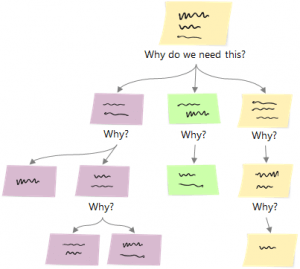 Asking questions about the value of the components (rather than their function) allows you to build a picture of how they will help you move towards your product’s vision. You’ll also get a sense of where the largest chunk of value is. At this point, if you feel like you need to change direction slightly or reduce the scope of the first deliverable, you can run a “five whys” exercise with the team. This not only helps you break it down but brings the whole team along with you so that everyone understands the rationale (this is especially important if the project is already in progress).