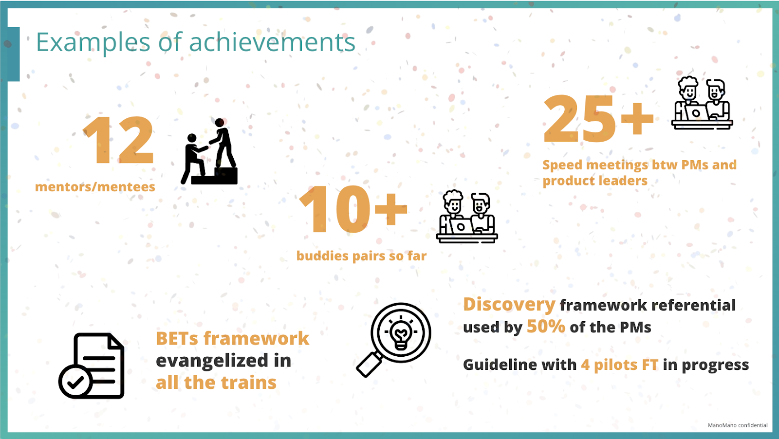 - To complete the point above, it is important to collaborate with product managers on specific topics to ease adoption or to begin with specific teams. This can ease (not solve) the evangelization part. At ManoMano, every Head of department was involved in a specific topic, and I also relied on volunteers PMs to work on specific topics.