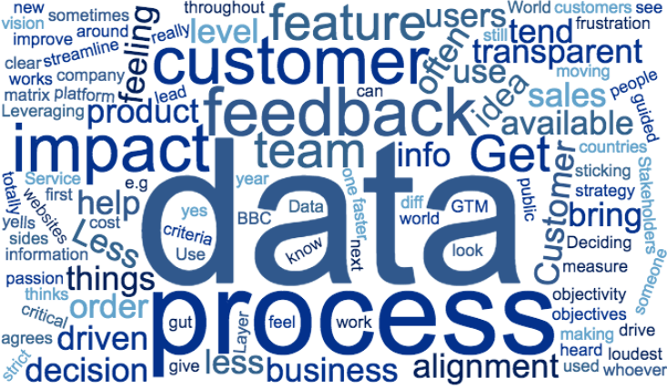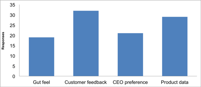 Being data informed is closer to the truth, with 60% to 70% of respondents listing product data and/or customer feedback as a data source. Gut feel and CEO preference are still important, each being listed by about 43% respondents.