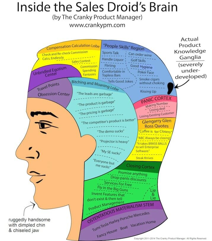 Of course it’s an exaggeration to say that salespeople are product managers, but the best salespeople I’ve ever met are the ones who spend time understanding their customers, their problems, and the things that keep them up at night. They can link this knowledge with the benefits offered by their products and communicate how their product solves customer/user problems, so that the product is selling itself.