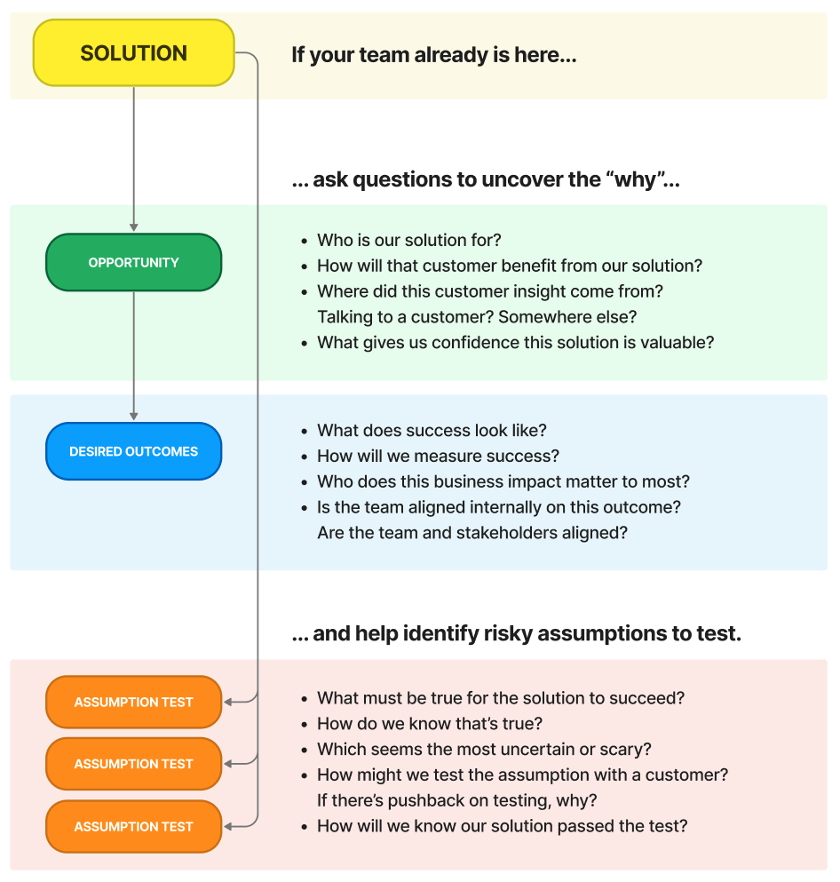 To build out our tree’s assumptions, we ask: what must be true for the solution to succeed? How did we arrive at those assumptions? Which assumption seems the most uncertain or scary? Before starting delivery work, how might we test that assumption with a real customer? If the team resists testing with or talking to customers, what is causing that friction? How will we know our solution passed the test?