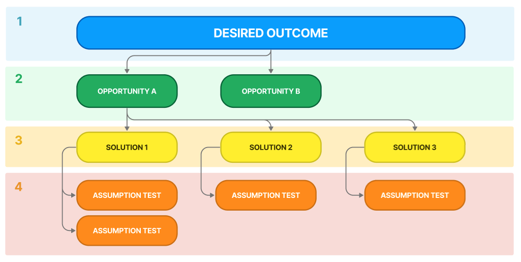 The Opportunity Solution Tree concept comes from Torres’ book “Continuous Discovery Habits.” A team engaged in Continuous Discovery includes a product manager, designer, and engineer empowered to solve a problem. The Opportunity Solution Tree maps the team's paths to moving a business goal forward.