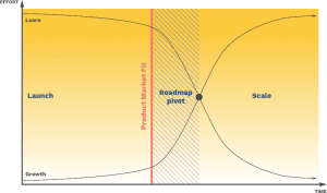 To avoid the roadmap dilemma, many rely on a rather radical approach: focus exclusively on Learning, until the MVP deadline has been met, and then shift entirely on Growth. As can be seen on the diagram below, however, both modes naturally coexist throughout the product cycles, due to market constraints.