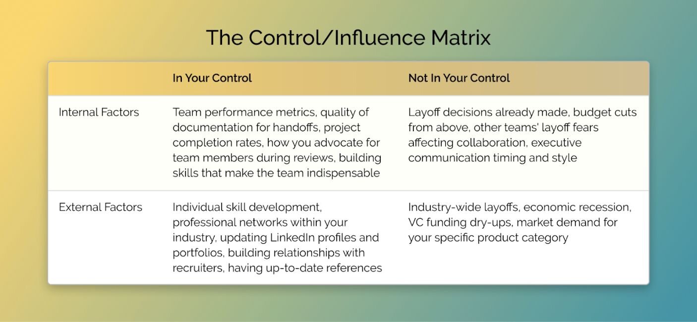 Use it to guide your crisis leadership. The "internal factors you control" become your layoff-season priorities - how you communicate uncertainty honestly, how you advocate for your people in leadership meetings, how you help them prepare professionally without creating panic.