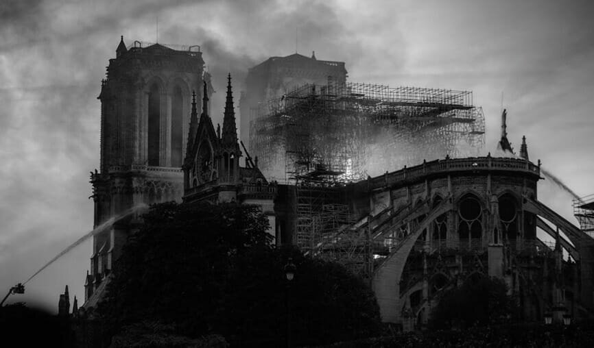 On April 15, 2019, a fire started below the cathedral’s massive attic, spreading quickly through the aging wooden beams and rising up into the roof. Within an hour, the iconic rooftop spire, weighing 750 tons, collapsed, creating a blast of energy so powerful that it shut all of the doors inside the building. The fire was so intense that it wasn’t clear in the early stages whether the cathedral could be saved, but with heroic efforts by firefighters, it survived.