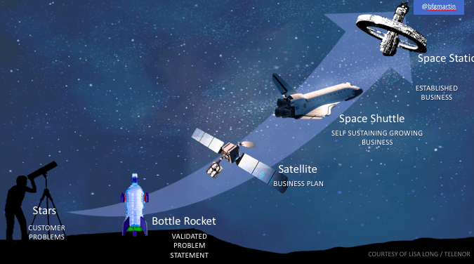 Product metrics are also discussed. For the first two phases of product (Stars and Bottle Rocket at Telenor), metrics evolve as we learn more about the problem being investigated. For the third stage (Satellite), metrics remain relatively stable over two or three product review cycles (every six to nine months), and change only as significant, new information comes to light (for example, a technical architecture change needed for progressing to new level of scale.) For the last two phases (Space Shuttle and Space Station), metrics do not change (at Telenor the timeframe is 18 months) as the problem is already well understood, the proposed solution is far along in development, and the markets they address are well-defined. It is possible that the metrics for Space Shuttle and Space Station could change over a longer period of time.