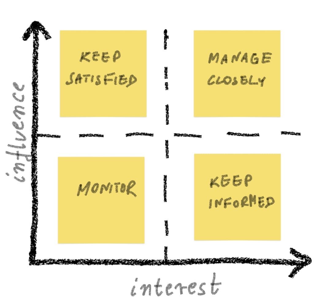 My favourite stakeholder mapping model is the interest and influence matrix. This is where you identify groups and individuals in the organisation that you should manage carefully because they not only have a stake in your product but can also decide about its fate (high influence, high interest). Then there are those you should keep satisfied because of how influential they are in the organsiation, even though they might not have a high level of interest in your product; those you should monitor from afar and those you should actively keep informed.