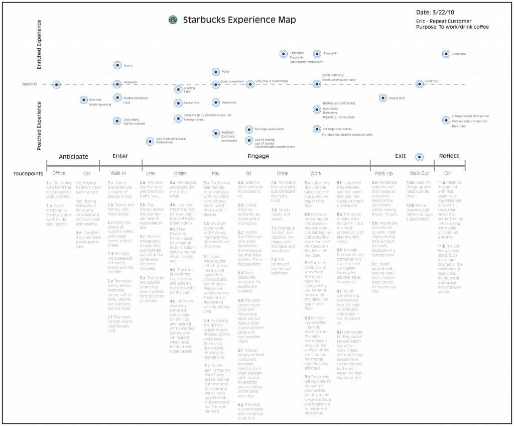The customer experience map created by Starbucks shows the possible steps of the customer who came to Starbucks to drink some coffee and work and the emotions he or she can feel in each place. It’s not a map which is likely to work for e-commerce but I think it’s very interesting and inspirational.