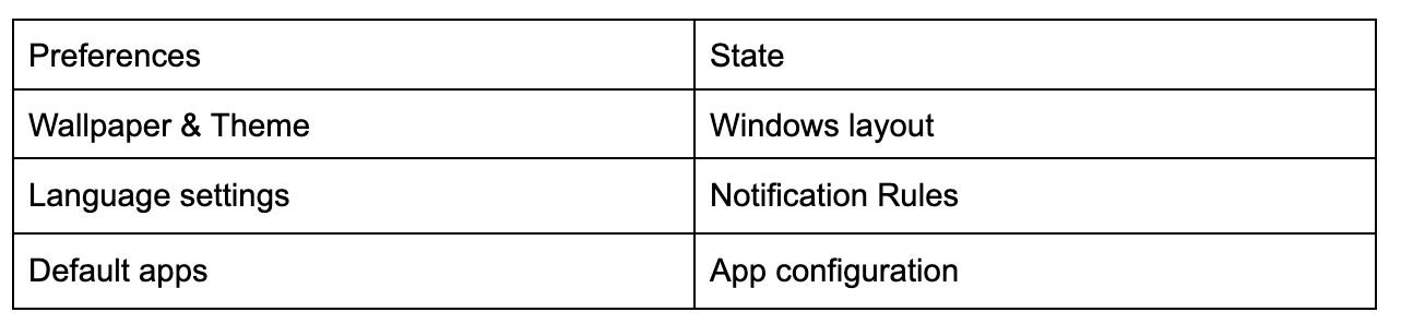 A simple way to understand the gap is through the distinction between preferences and state. Preferences are the cosmetic or one-time choices — wallpaper, colors, languages, default apps. State is everything that reflects how the user operates: which notifications they care about, which apps interact, which permissions they’ve granted, how windows are arranged, what tasks were in progress, and how work flows across devices. Today’s systems mostly restore preferences. They rarely restore state.