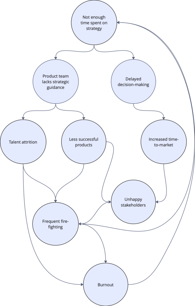 Spending too much time on operational tasks often creates a vicious cycle, making it even harder to refocus on strategic priorities. Without clear strategic guidance, product teams struggle with decision-making and achieving objectives, leading to delays and poor outcomes. Frustrated stakeholders demand more of your time to manage complaints and firefight. Over time, this cycle drains both you and your team, increasing the risk of burnout.