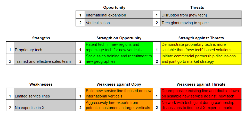 List three to four of each and plot a matrix. How can you use your strengths to combat threats? How can you patch out weaknesses to take advantage of opportunities?