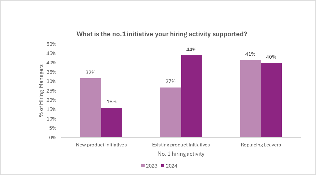 In 2024, only 16% of hiring managers said new product initiatives were their top priority (down from 32% in 2023). Instead, companies are obsessed with efficiency—optimizing, streamlining, and making existing bets work harder.