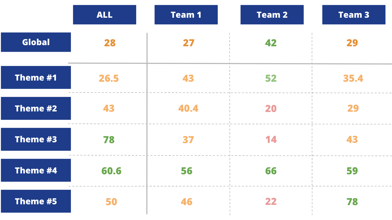 Thanks to the granularity of questions (find the right balance though) you know exactly where the most important frustrations are that prevent your team from moving forward (e.g should I work on implementing shape-up or developing data mindset of my product managers?). You can also segment the information by seniority, teams or offices to focus on a specific part of your team and if you have to adapt your work after that.
