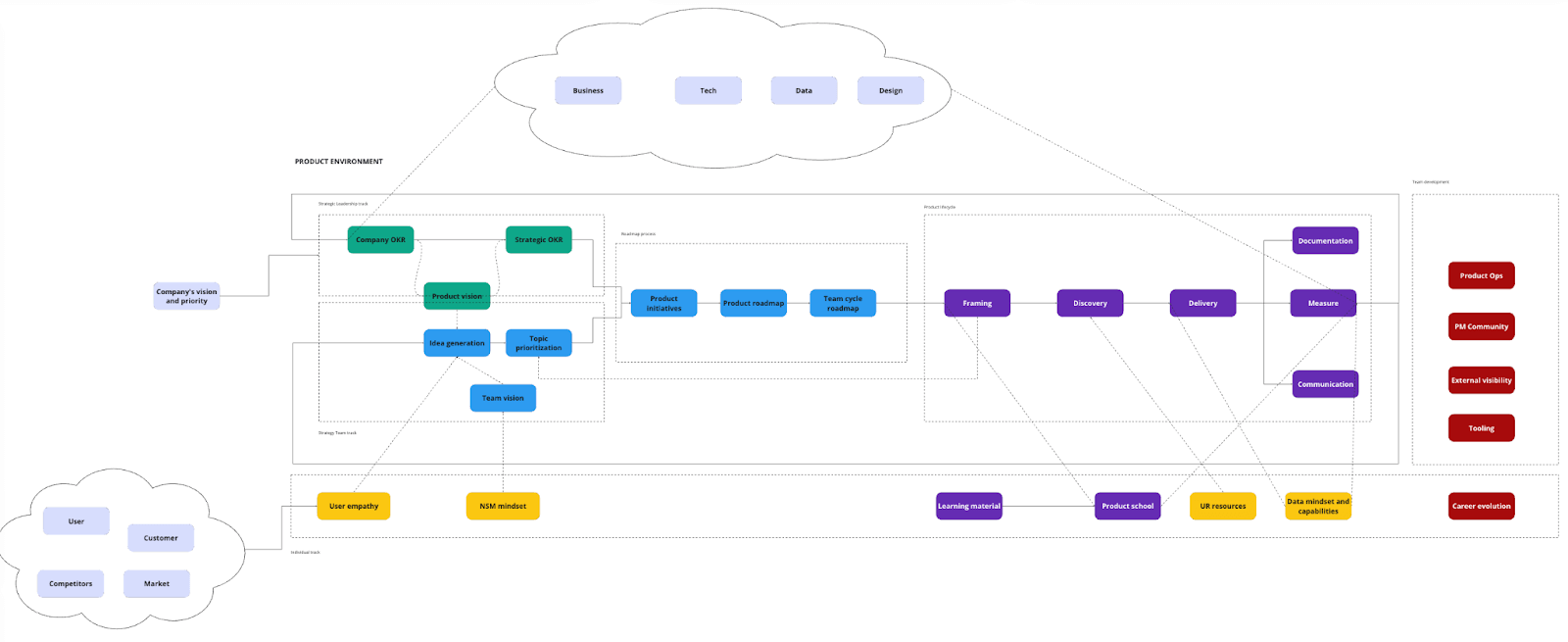 In a nutshell, the product environment is the whole in which product people evolve. It displays all the steps, interactions, material and moments that build the product journey in a company. Of course, culture, organization and frameworks are part of it, but as they are mixed with other components you will be able to figure out which is the most mature for your team.