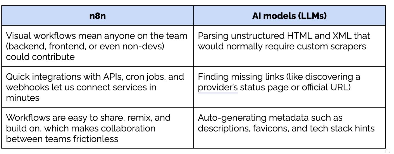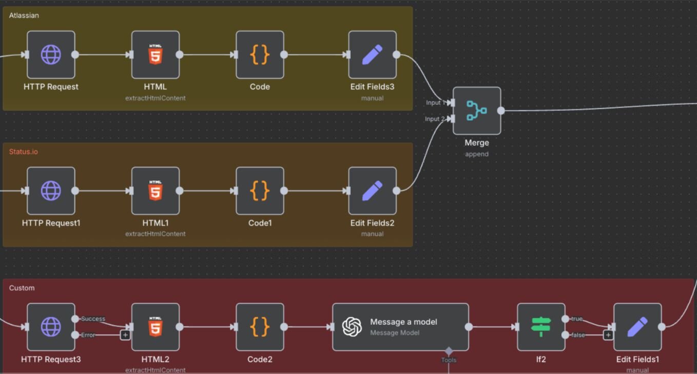 n8n gave us a way to build workflows visually, connect APIs, scrape data, and transform it without spending half the hackathon setting up boilerplate. For problems like status aggregation or metadata enrichment, that speed mattered more than perfect abstractions.